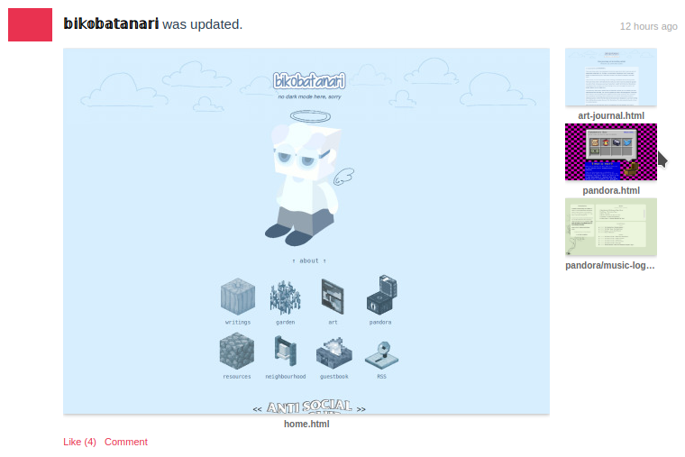 (like the favicon of websites, or the icons of games) . - See this as a springboard to jumpstart into the waters and swim towards the sites that interest you. Most sites in the Personal Websites section have other Links/Neighborhood sections that also link outwards to even more sites as well, leading to a lot of rabbit holes you can stumble into if you so desire.